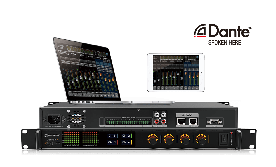 CONFER X - это цифровой автоматический микшер с 64-канальным входом и 16-канальным выходом, разработанный независимо компаниями Relacart и the global-first creation. 64-канальный вход, 16-канальный аналоговый выход и цифровое гибридное матричное управление DANTE подходят для более широкого применения в инженерных системах.