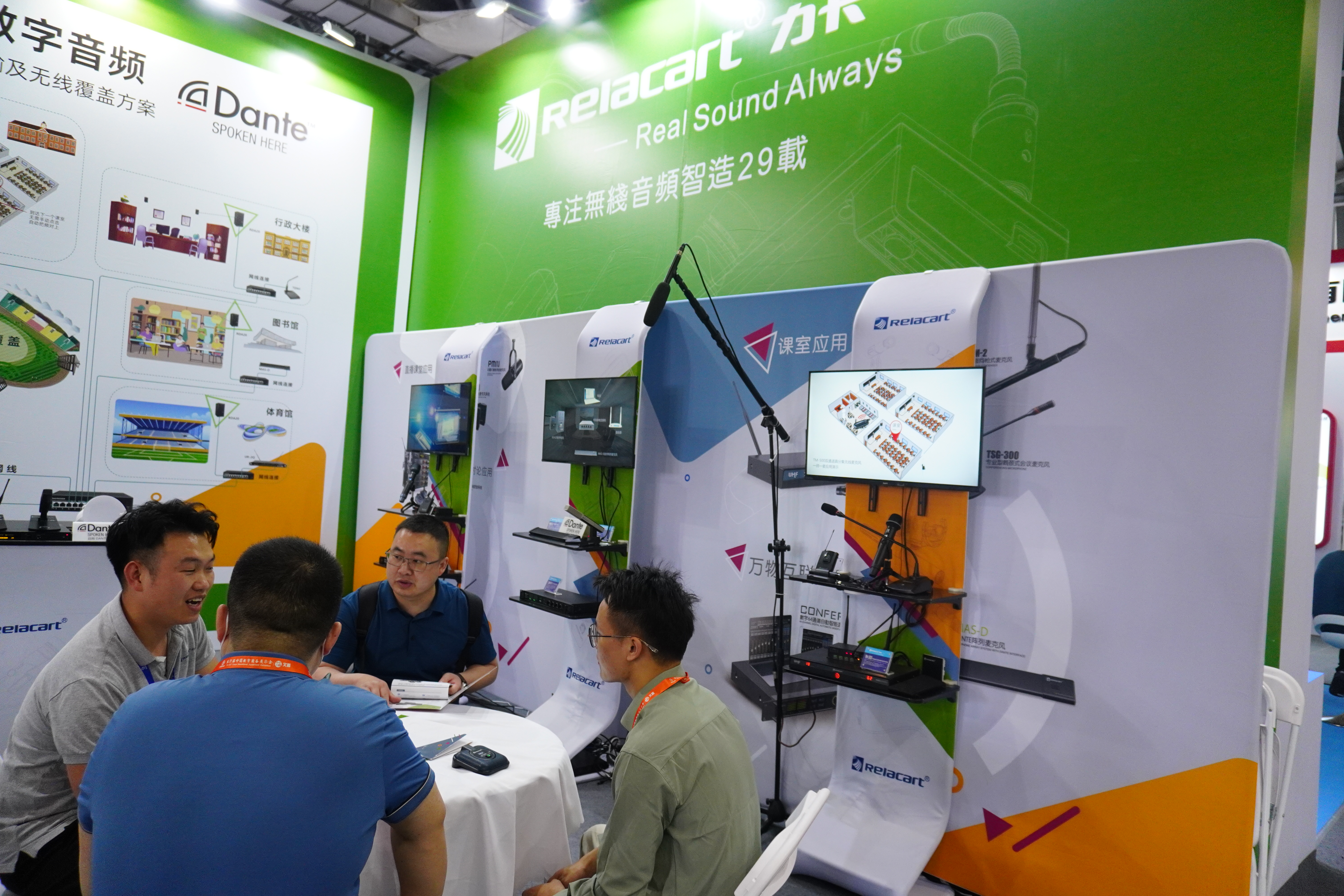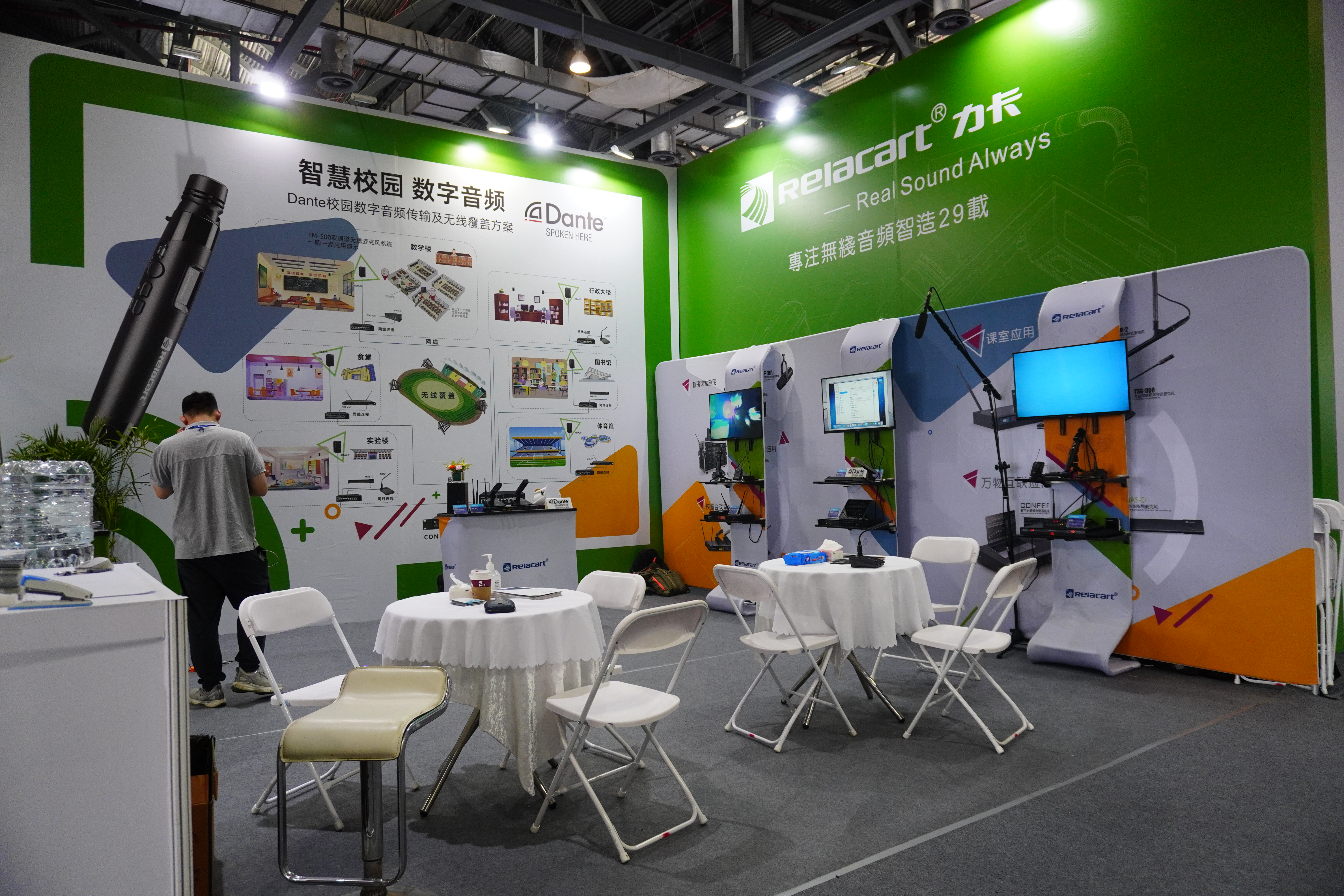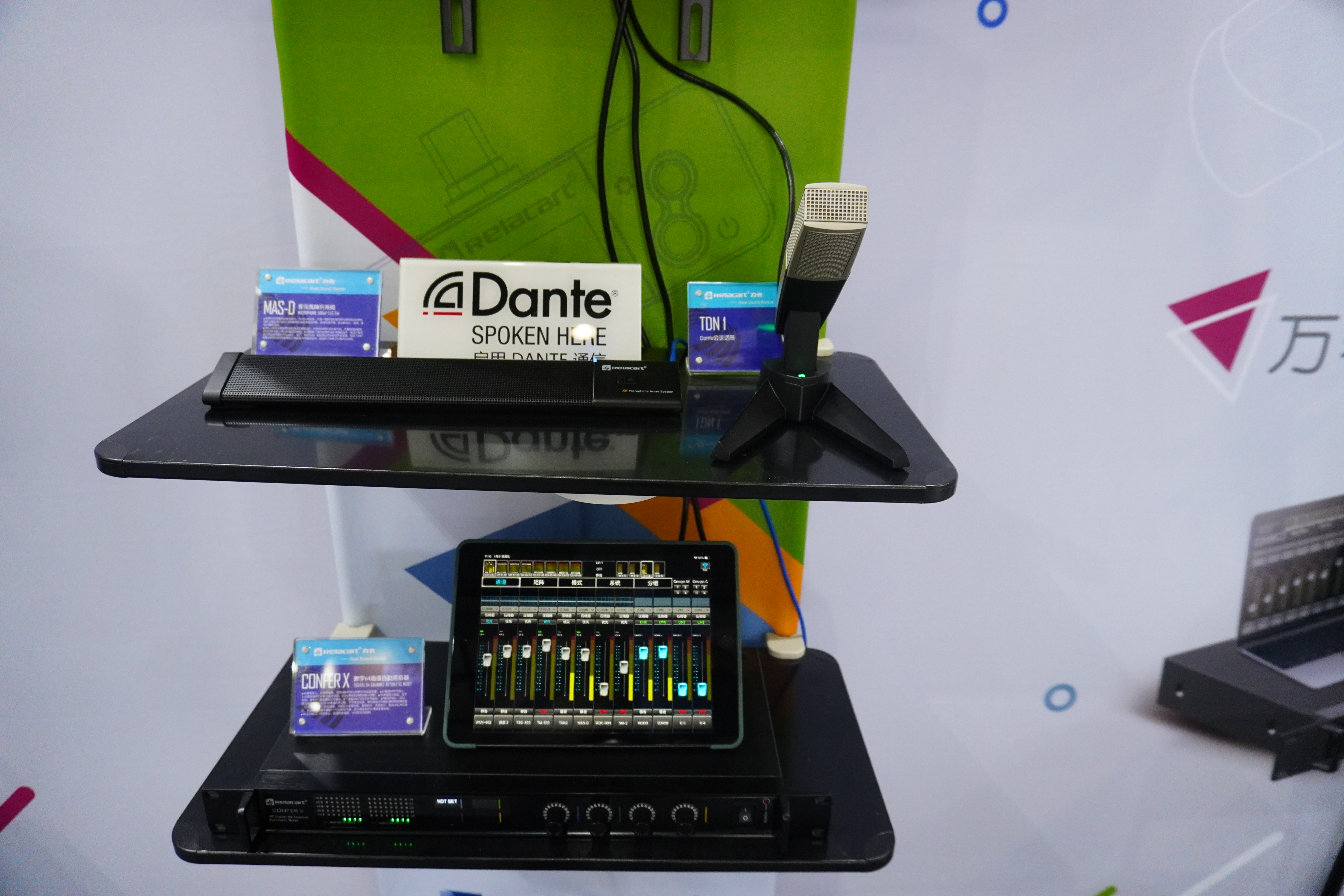 На этой выставке компания Relacar представила новое учебное оборудование, в том числе недавно модернизированный Проводной цифровой 64-канальный интеллектуальный микшер CONFER X,двухканальная беспроводная микрофонная система True Diversity,беспроводная микшерная система Intelligent True Diversity,беспроводная микрофонная система UHFи другие интеллектуальные беспроводные устройства.