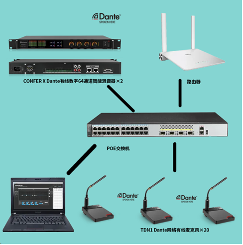 In order to make the equipment universal, we chose the CONFER X Dante wired digital mixer as the receiving microphone signal, which is the golden partner of the TDN series, The CONFER X Dante wired digital mixer also supports Dante audio transmission technology and has a dedicated operating software. Users can connect after installing the software on a PC or iPad, and can quickly and easily set detailed parameters such as channels, matrices, modes, systems, and groups. At the same time, the sound volume of the mixer itself can be adjusted to affect the sound reinforcement system, thereby adjusting the sound. Compared with other brands of mixers with backward technology and no operating software, this system has a clear interface and simple operation. Users can adjust it by themselves and easily get the perfect sound quality as they want.