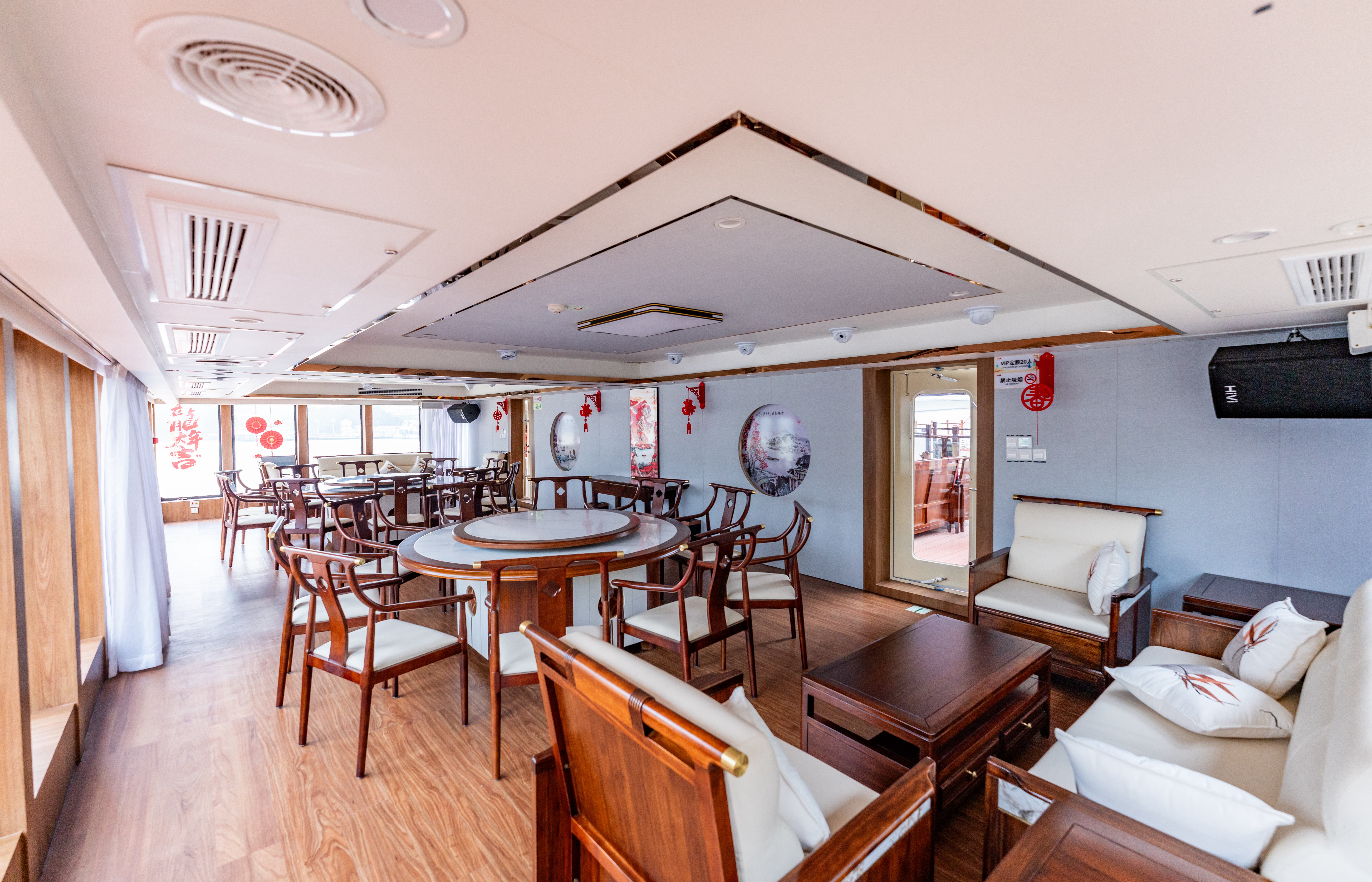 "Golden Jubilee" is one of the new energy cruise ships for night cruises on the Pearl River. The overall design combines Chinese style with Lingnan culture, like a classical courtyard on the water. On the evening of February 2, 2024, the "Golden Jubilee" successfully made its maiden voyage at Guangzhou Dashatou Pier.