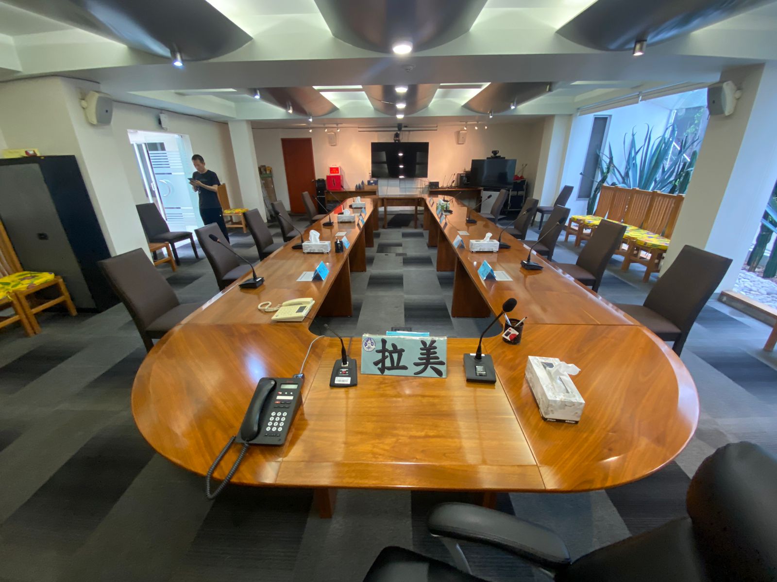 В конференц-зале используется настольный беспроводной конференц-микрофон UD-222 с подставкой для микрофона Relacart gooseneck. Простой и элегантный стиль в большей степени соответствует эстетическому вкусу китайцев. Корпус изготовлен из прочного металлического материала и оснащен встроенным фильтром верхних частот и функцией регулировки усиления, а также сенсорным переключателем отключения звука.