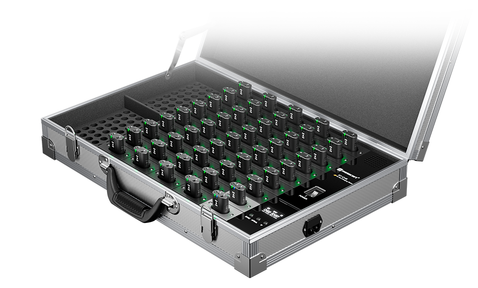 RT-C45 - это кейс для хранения и зарядки устройств TGS-6, способный заряжать 43 приемника и 2 передатчика одновременно. Кроме того, он может автоматически выполнять поиск, установку и синхронизацию рабочей частоты. Зарядный блок может устанавливать частоту канала вручную или автоматически, а также синхронизировать информацию о настройках всех устройств с помощью кнопки синхронизации "SYNC". Цельнометаллический корпус отличается прочностью и долговечностью, а удобный дизайн удобен в переноске и использовании.